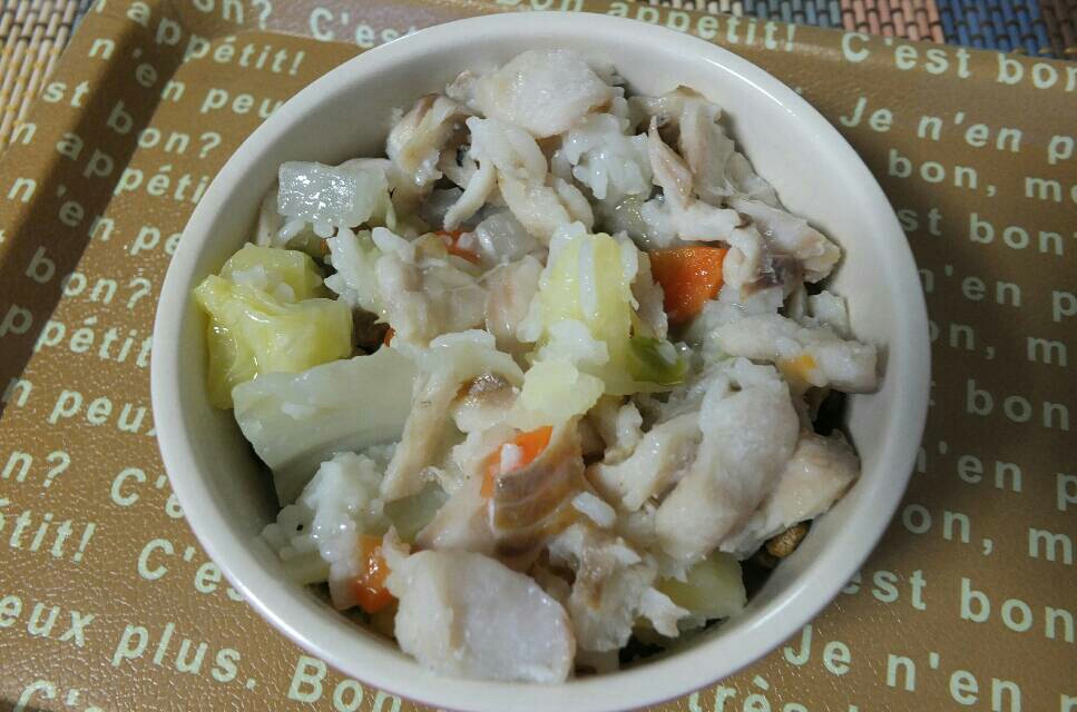 お米、じゃがいも、人参、ごぼう、キャベツ、大根、タラ。