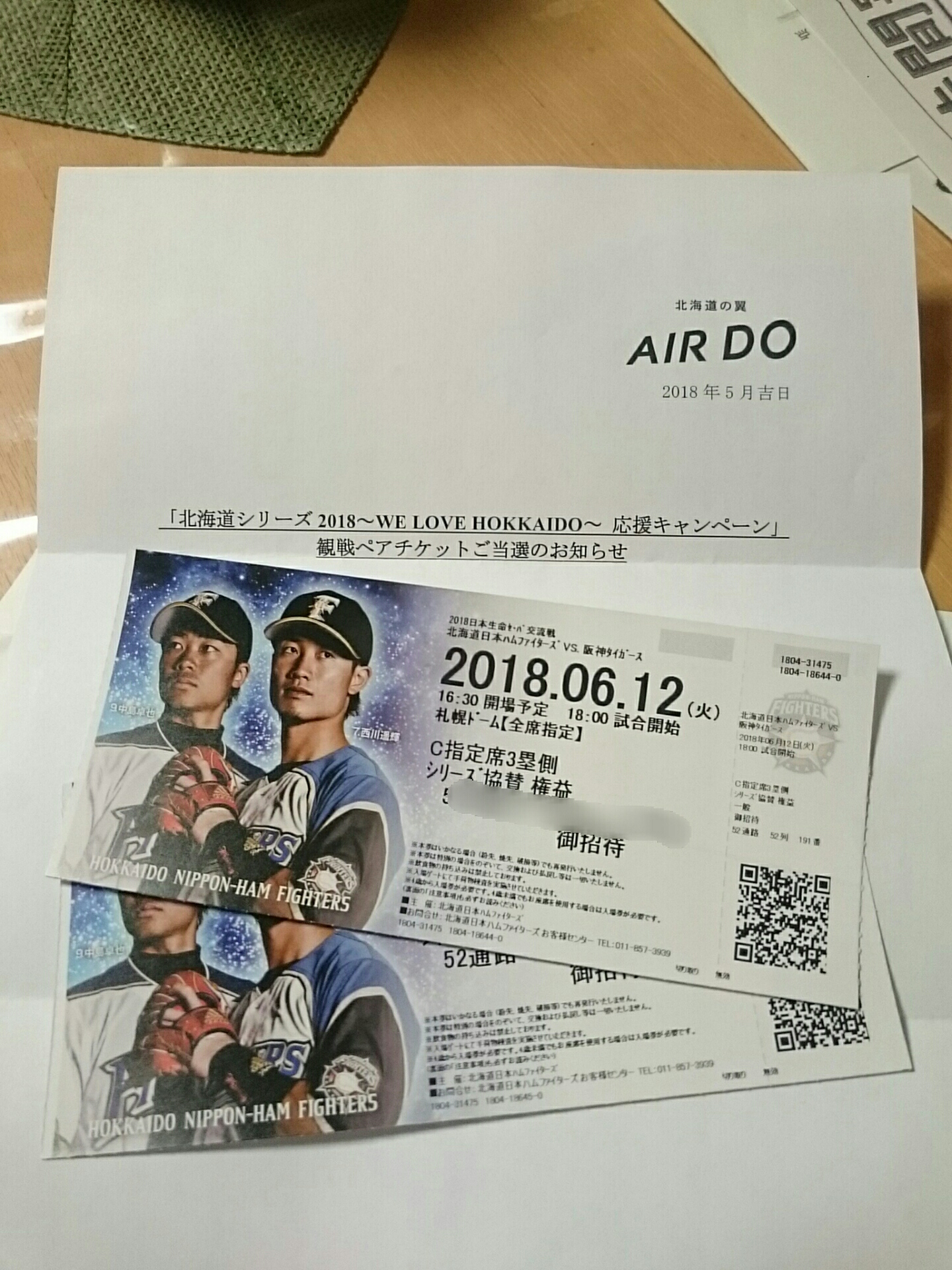 日ハムチケットきたぜーー!!