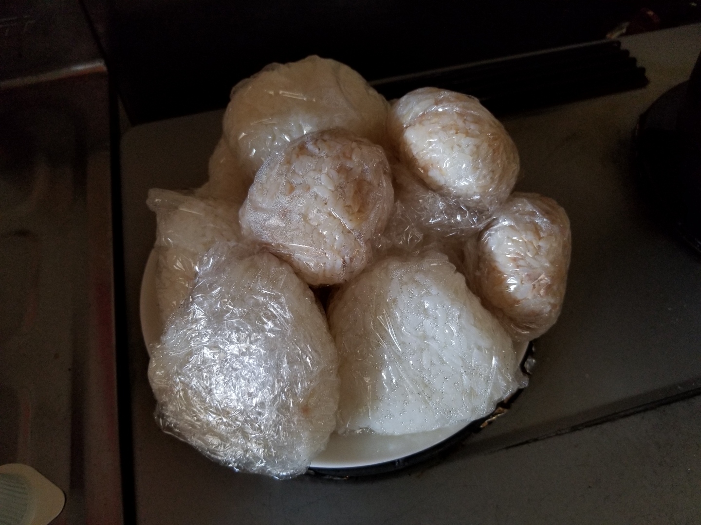 コンロで白米を炊き、塩むすびを作りました。