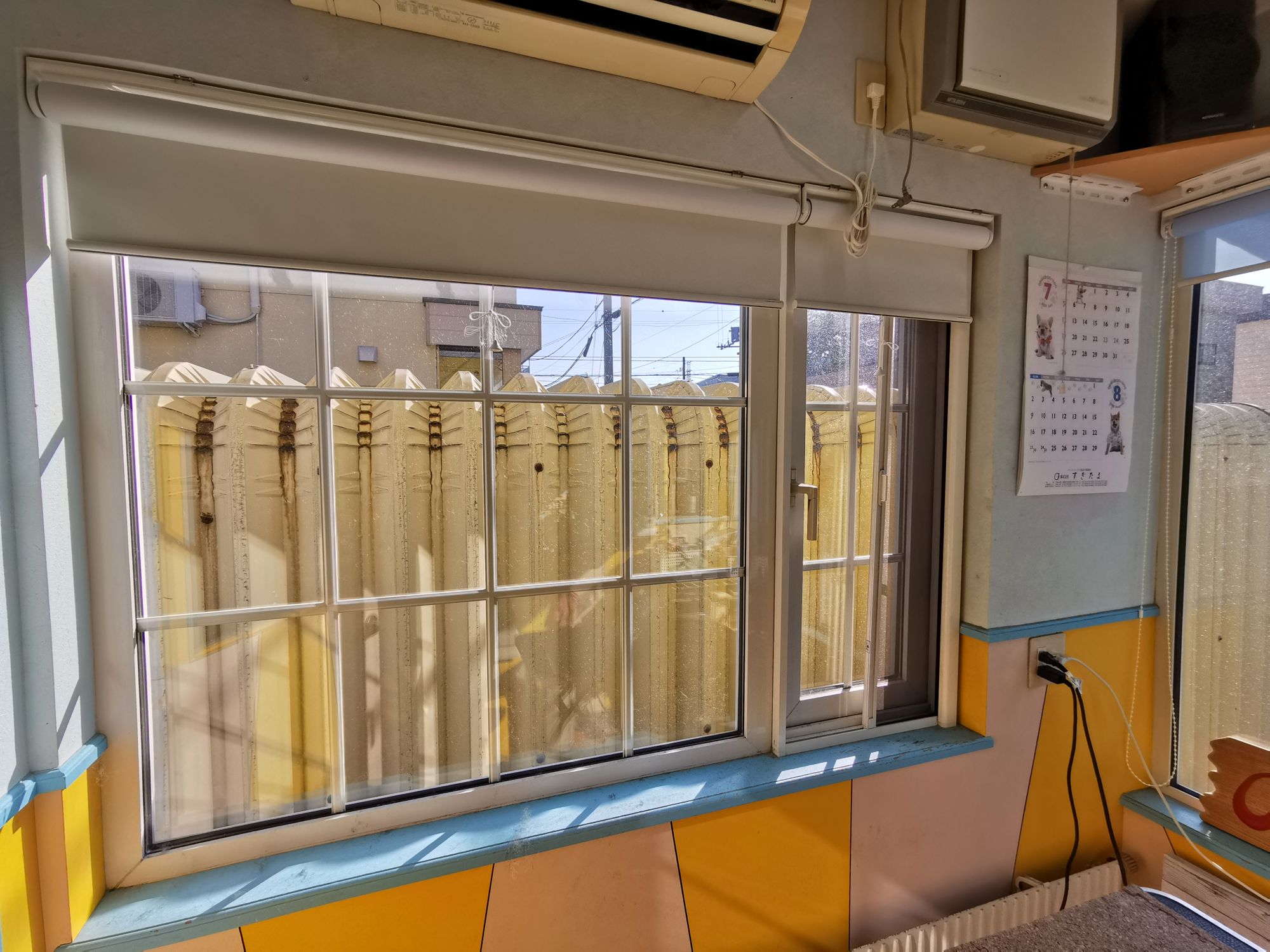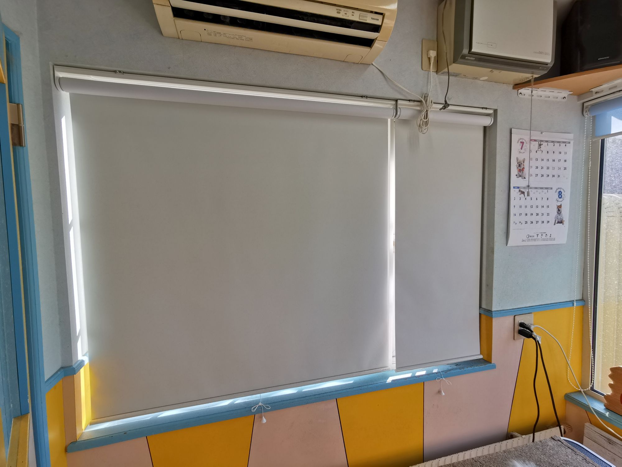 遮光ロールカーテンでお見事に日差しシャットアウト。