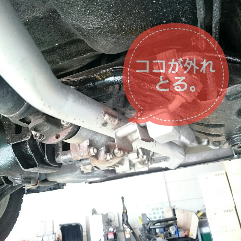 わかりますかね?マフラーを支えてる部品が外れとーる。