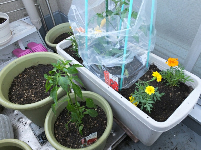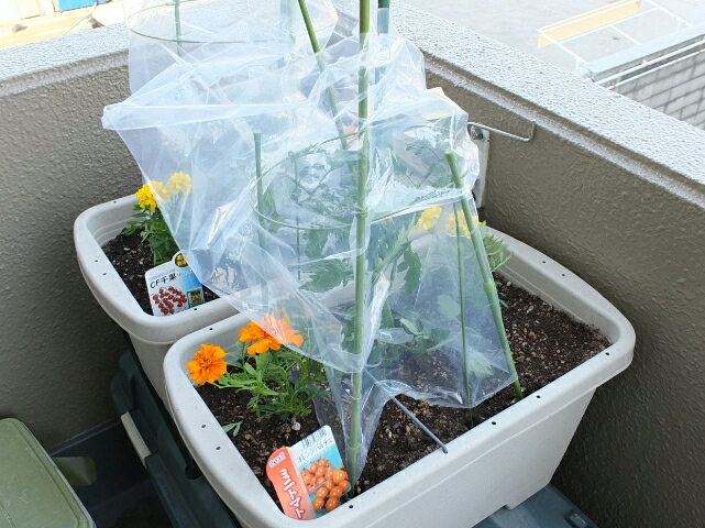 まだまだ朝晩は冷えるので、ビニール巻いてみました。