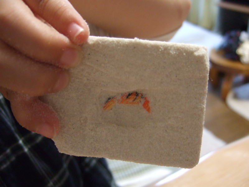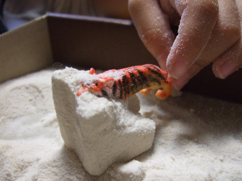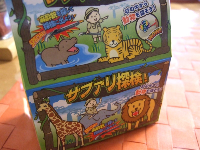 砂の塊の中に、動物フィギュアが入っているのを「発掘」する玩具?です。