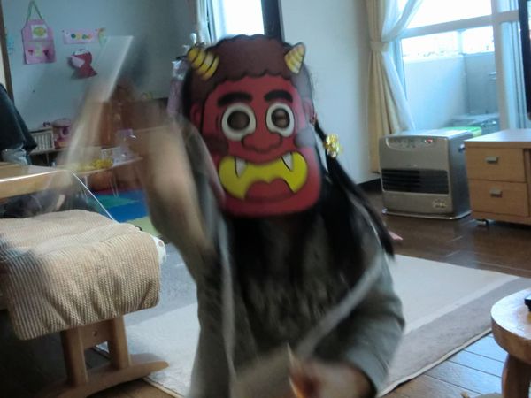 幼稚園も豆まきだったようで、予想以上の「リアルな鬼」の登場に