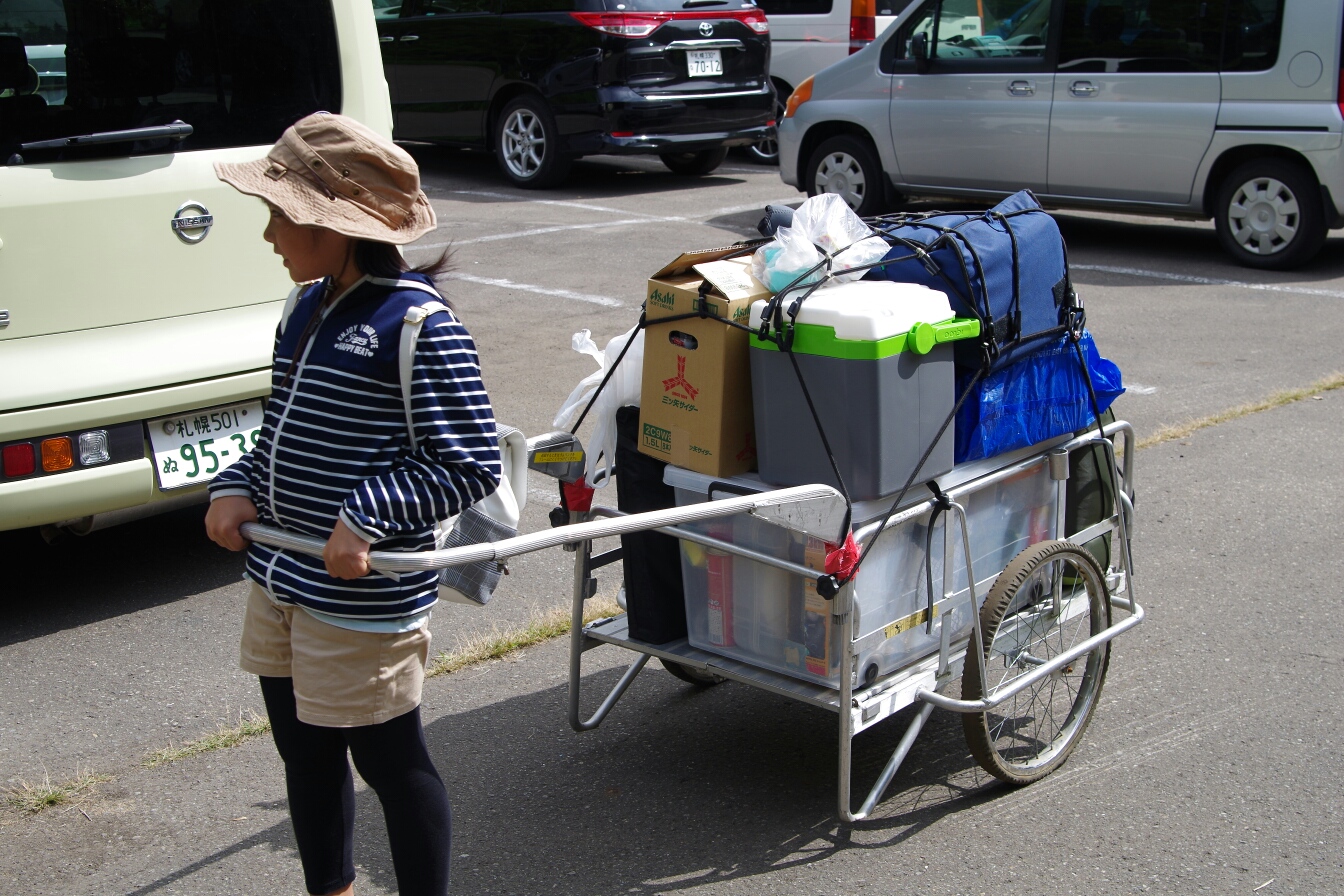 駐車場から、荷物をリアカーに乗せ、1キロ弱歩きます…。