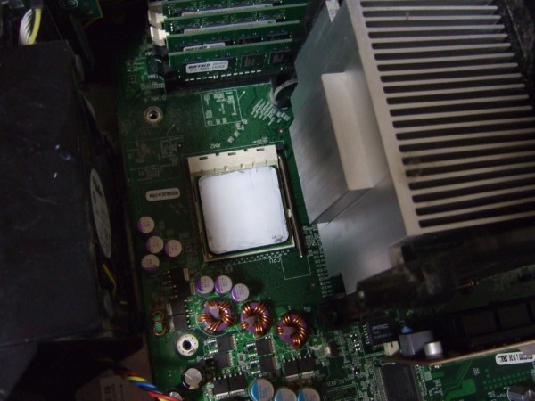 発熱を抑えるグリスを塗ったくって換装完了。この白いのがCPUです。
