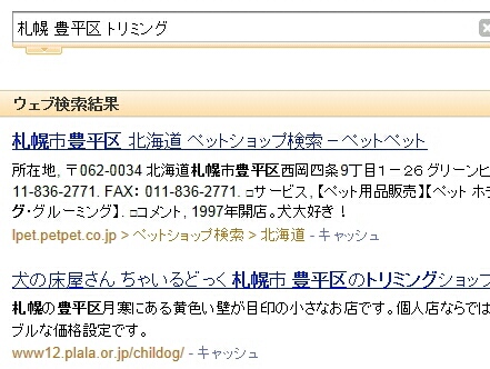 「札幌 豊平区 トリミング」で検索すると、なんと1ページ目のトップに表示。