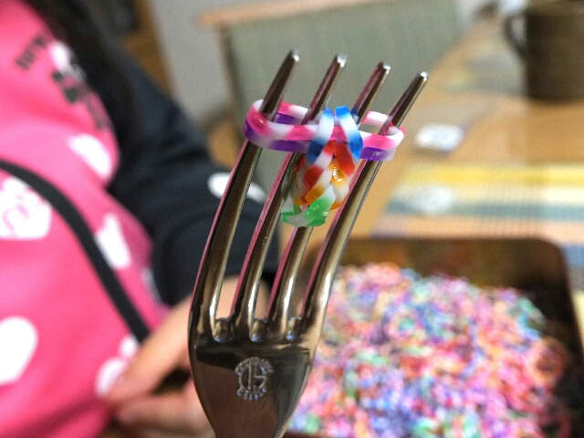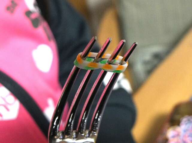 まずはフォークに輪ゴムを「8の字」にかけて